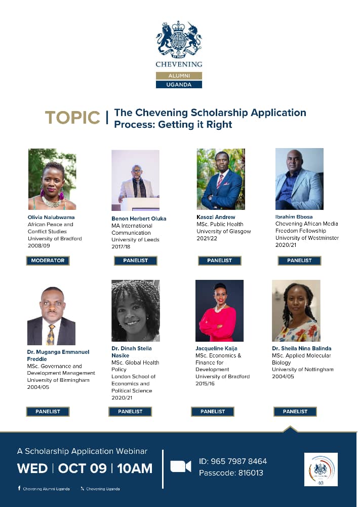 REMINDER: The Chevening Alumni Association of Uganda will host a scholarship application webinar via Zoom on Wednesday, 9 October, 2024. To participate in the webinar, use ID: 965 7987 8464 and Passcode: 816013. For regular updates from the Association, follow them on LinkedIn, X, Facebook and YouTube.