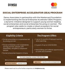Do you own an enterprise that aims to solve social, economic, or environmental challenges in Ghana? The Social Enterprise Accelerator (SEA) Program, spearheaded by Densu Associates in partnership with the Mastercard Foundation, is now accepting applications. This initiative is designed to support young women leading social enterprises, as well as those enterprises focusing on women.