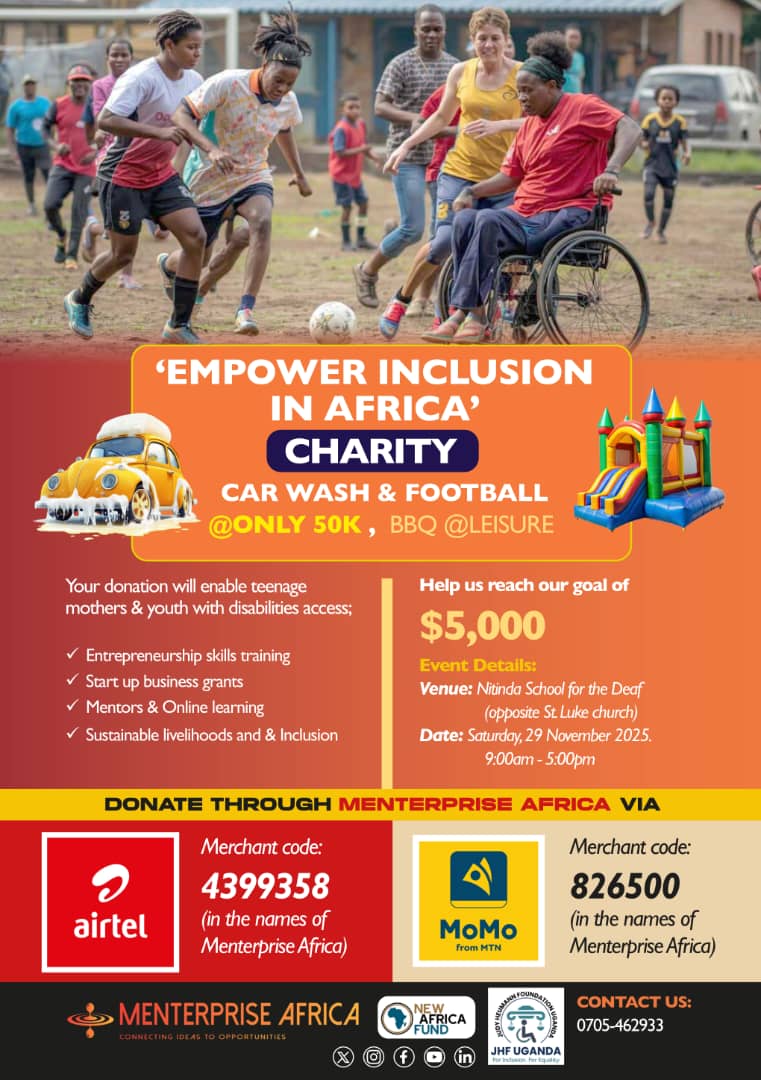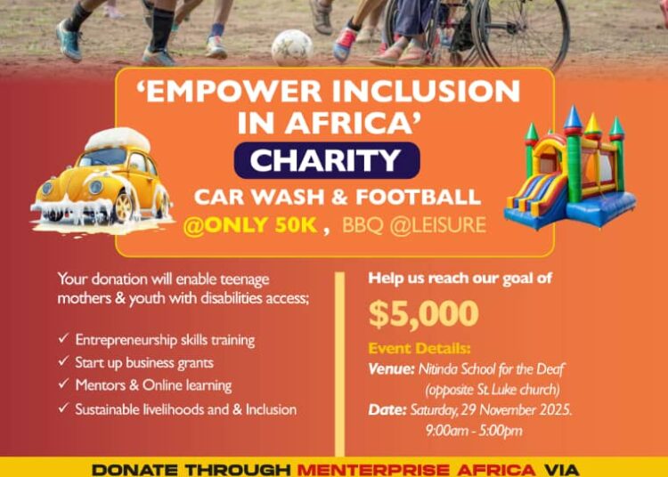 On Saturday, 29 November, all roads lead to Ntinda School for the Deaf (opposite St. Luke’s Chapel), where Menterprise Africa has organised several charity and recreation activities such as a car wash, fun football games, barbecue, soft drinks, a mini-market and children’s games such as bouncing castles and sack races.