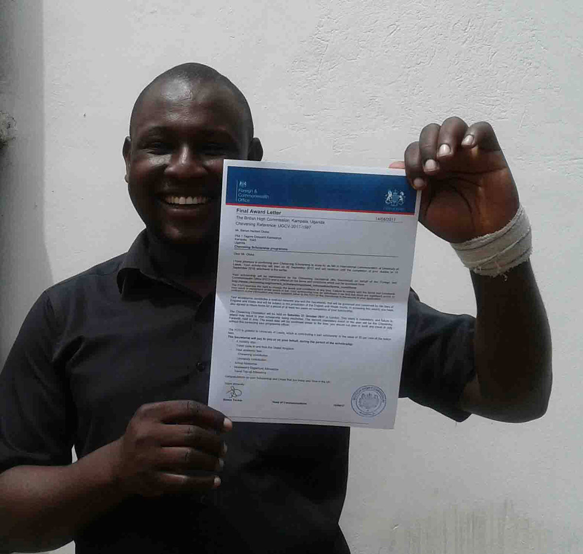 Benon Herbert Oluka received a Chevening scholarship in the 2017/12018 academic year to pursue a Masters degree in International Communication from the University of Leeds, from where he graduated with a distinction. While in the UK, he was emerged among the 10 Chevening scholars selected for a three-month post-study placement at the BBC World Service in London, where he worked as a trainee radio producer on the NewsDay programme.