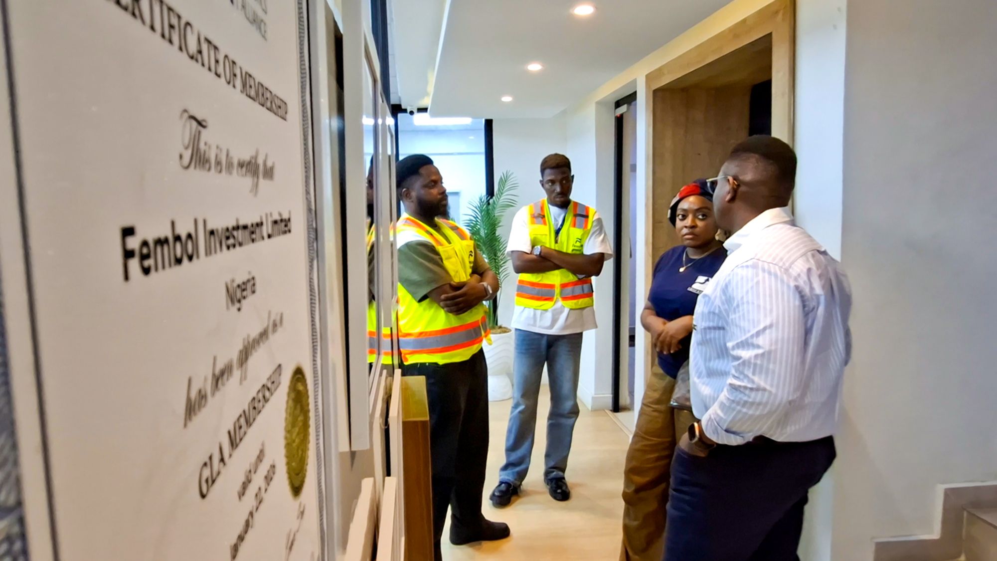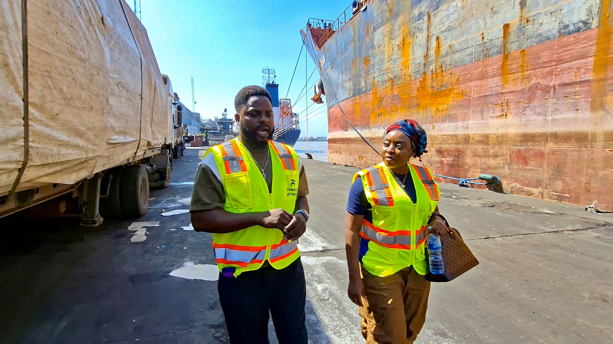 Oluwafemi Bewaji, Managing Director of Fembol Group, briefing his team and Amanda Etuk, a Nigerian Venture Capital operator, before a routine port visit in Apapa, Lagos on October 9, 2025. Photo: Idongesit Essien, bird story agency